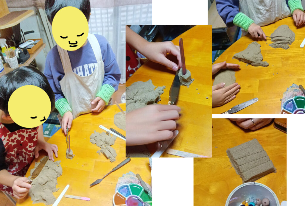 写真-11 キネティックサンド。何回も遊んでいるので、砂の扱いが丁寧になってきました。パレットナイフの使い方も、いい感じです。そして、お気に入りのナイフの争奪戦は、今回もありました。