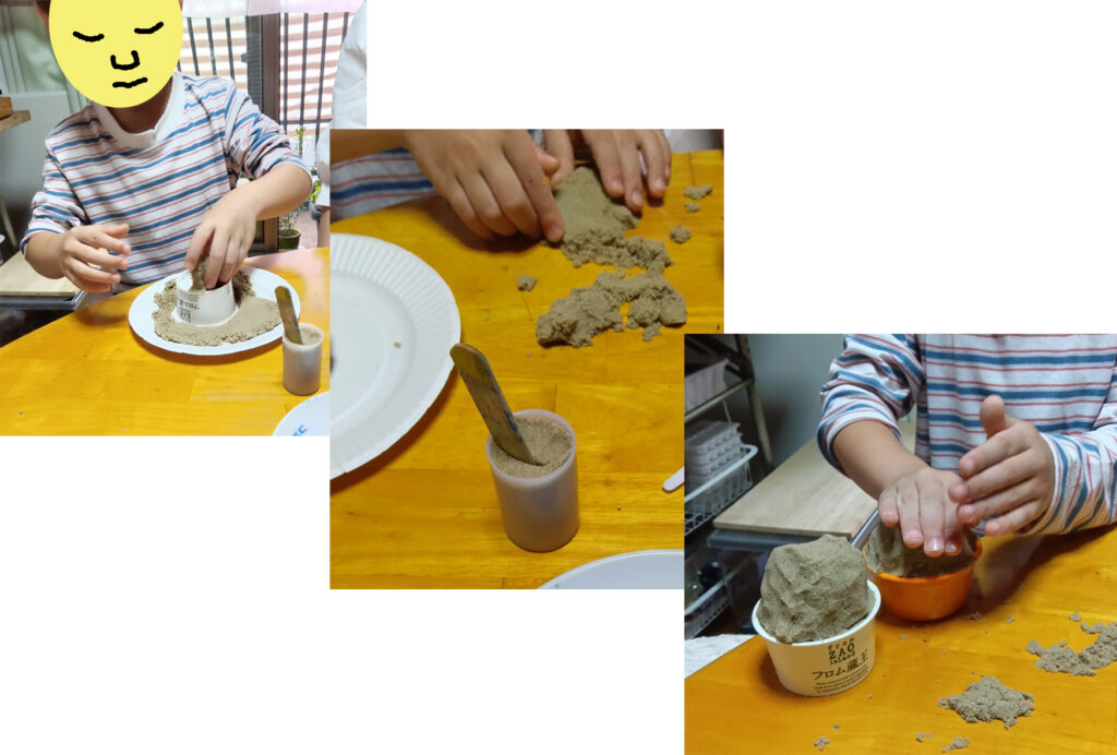 THくん、「じゃ、ちょっと砂を入れたらね!」と言って、手元に持って行きます。どうなるかなと、見守っていたら、「はい!」と、弟のTDくんに渡してました。ほんの、10秒もないくらいの仕切り直しでした。これができるのは、すごい!!と思いました。