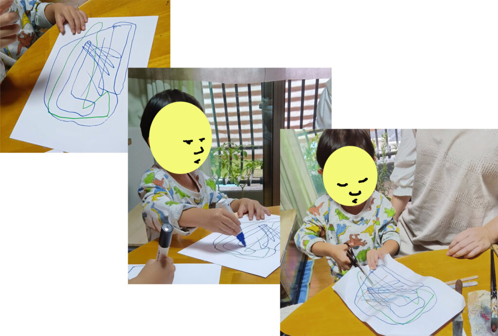 写真-7 TDくん。最後の絵です。ポスカで、大きいぐるぐるを描いて気持ち良さそうなのでした。描き終わって、たたんで伸ばして、ハサミで切ってます。ハサミ、集中していい感じです。