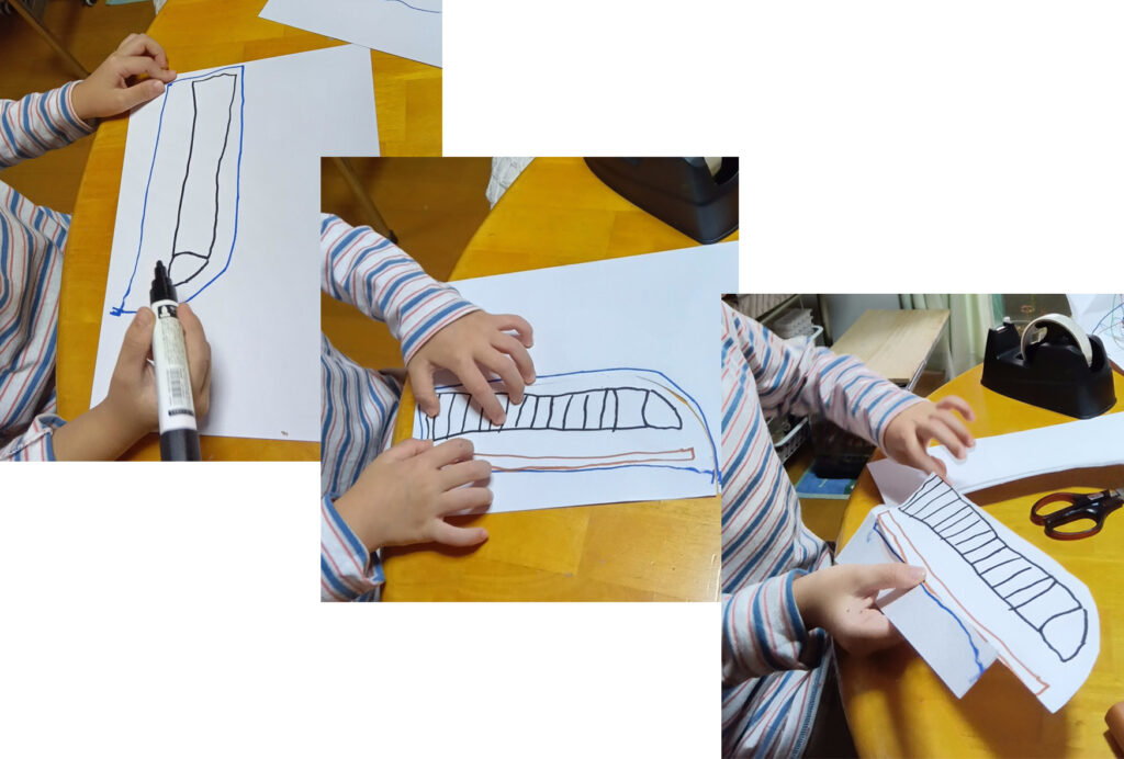 写真-6 THくん。最後の絵です。ポスカでのびのび線を引いてました。線の通りに切って、またセロテープで留めているのでした。描くのも切るのも貼るのも、味わって楽しそうでした。