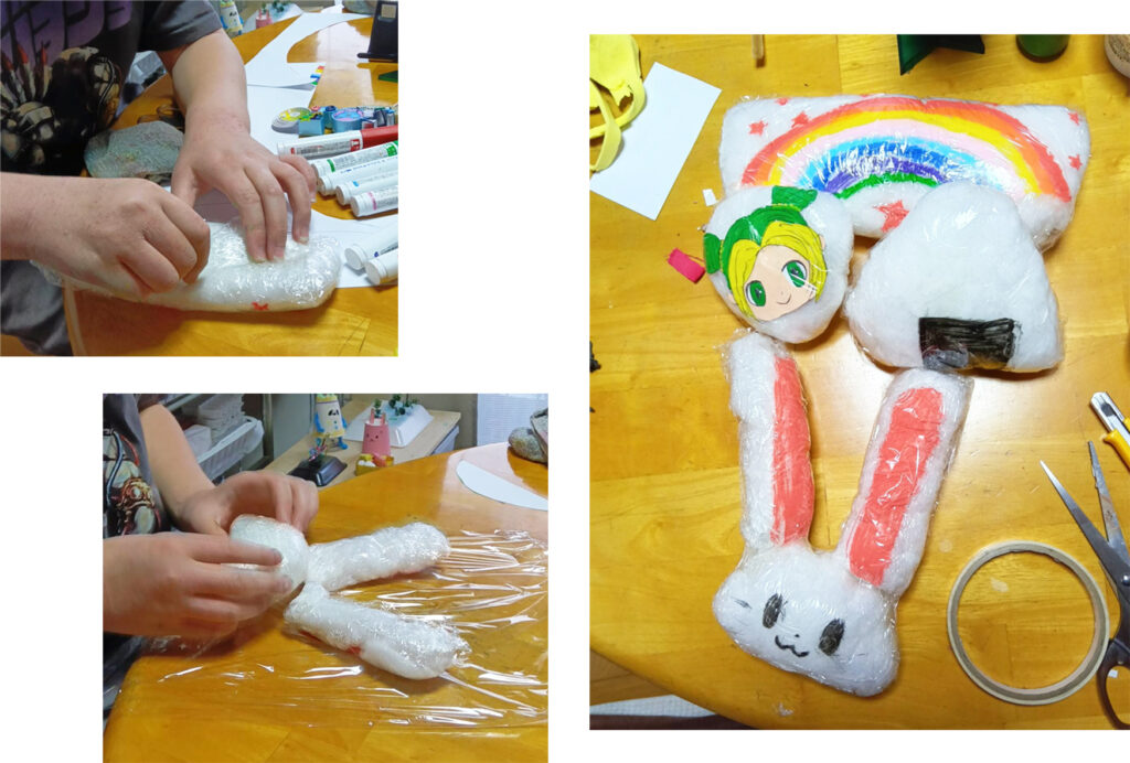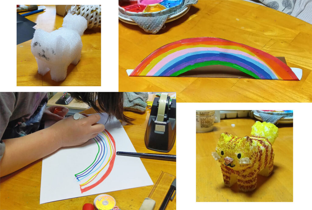 Iちゃん、画用紙に虹を描いて、ジョジョの後ろに置くアイデアを作り始めたんですが、途中でそれは、虹の枕を作るアイデアに変わりました。画用紙の虹は、補強してアトリエに飾っておくことにしました。綿のスクイーズは、その後、ウサギとおにぎりを作りました。