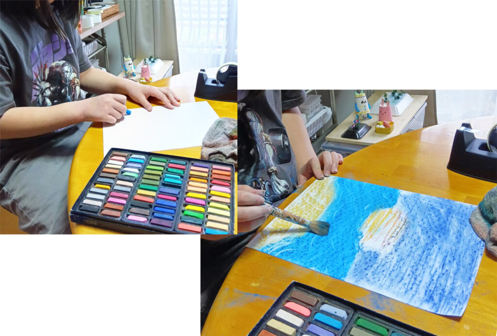 Iちゃん、パステルで海と空と太陽の絵を描きます、海の波を描きながら、海で遊んだ夏休みを思い出しているようです。たっぷりの青で描くと、気分が変わります。色って、そういう効果があるのです。