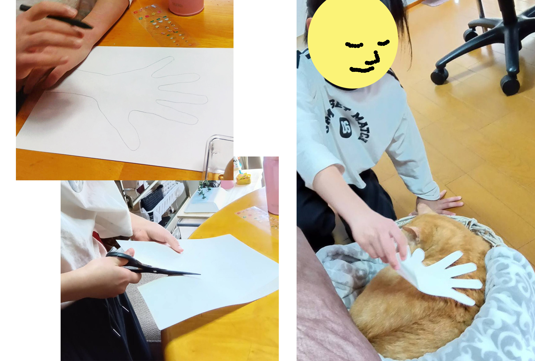 Aちゃん9才、12回目のアトリエです。こんにちは!と素敵な笑顔です。テーブルに来ると、「紙、ちょうだい?」と、画用紙ではなくて、コビー用紙を1枚使って、手形を描いています。丁寧なきれいな手形です。何ができるのかなー?Aちゃんは、それをハサミで切り取って、ネコのキリシマくんの所へ行って、切り取った紙の手で、キリシマくんをそっと撫でるのでした。キリシマくん、そのままじっと眠っているようです。ただ眠ってるだけで、ムードメーカーのキリシマくんなのです。その後も、ときどき工作の途中で、キリシマくんの所へ行くのでした。「こんなのできたよー」とか話しかけて、見せています。キリシマくんが、くんくんしているので、私はキリシマくんのセリフを言って遊びます。「それは何?食べられるのかい?」。おやつではないとわかると、また眠ってます。ゆっくりした時間が流れていきます。