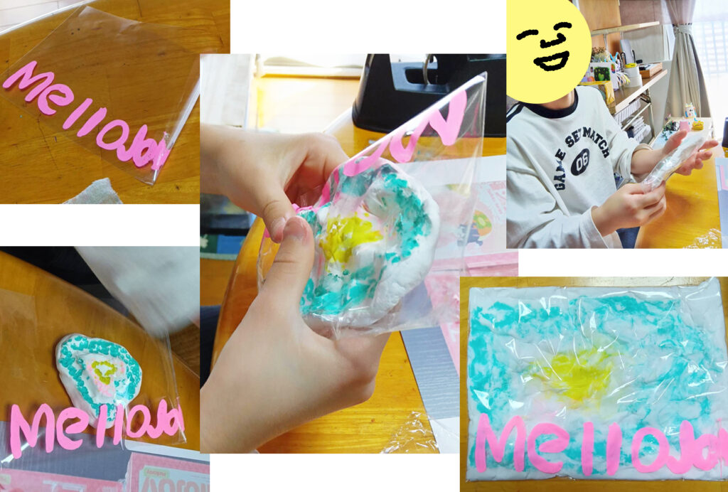 Aちゃんが、欲しいなと、言っていたメロジョイは、これなのでした。なるほどー。Aちゃんは、メロジョイをイメージして、作り始めます。メロジョイのパッケージをネットで探して、プリントアウトして、それを見ながら、Aちゃんは、パッケージから作ります。最初に、Mellojoyと描いたビニール袋を作ります。紙粘土でお菓子を作って、色を付けて、ビニール袋に入れて、セロテープで留めます。そして、ビニールの上からぐいぐい触って、感触を味わって、平らにしていくのでした。「ホントのメロジョイは、形が元に戻るんだけどね、これは戻らない💗」。すごく楽しそうなのです。袋を切って、紙粘土を取り出して、また別の形を作ります。今度は、肉球のあるネコの手です。