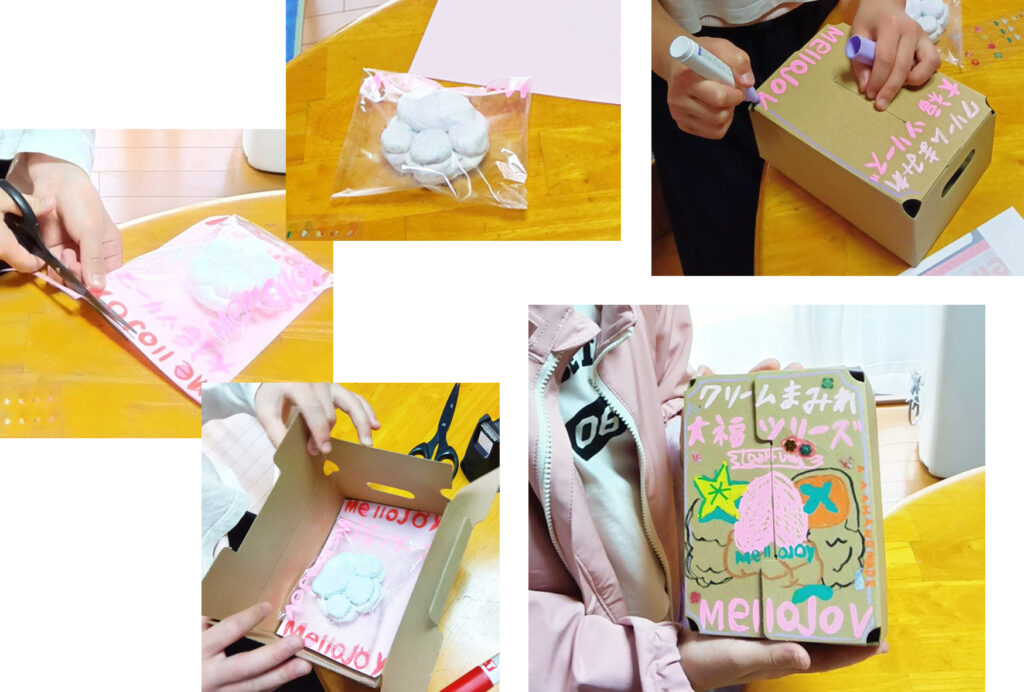 今度は、それを入れる箱も作ります。ポスカで、メロジョイの外箱を描いていきます。ホンモノの外箱の写真を参考にして、どんどん描いていきます。メロジョイのアルファベットは、きっと何回も描いているので、サラサラっと空で描けるのだなあ。ネコの肉球は、ビニール袋に包装されて、箱に入れられて、完成なのでした。