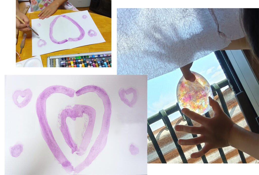3枚目、大きな筆に水たっぷりの絵の具で大きなハートを描いてます。水遊びと水彩は、すごく近い。水を遊ぶと、面白くなるはずなんです。すると、絵の上手い下手は、関係なくなっていきます