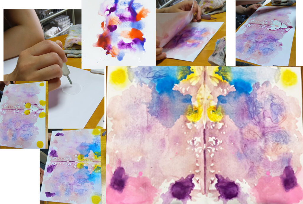 その後、黄色、ブルー、ピンクが、ゆっくり足されていきました。それをまた二つ折りにして、開いて。。穏やかな呼吸と一緒に、絵は進んでいくのでした。