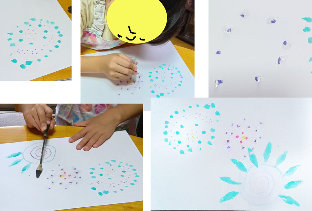 お母さんの水玉から始まった絵は、スポイトで、水を垂らして、表面張力で水玉が出来て、それを眺めてゆっくり味わってました。そこに、少しづつ色が足されていきました。色の冒険が、始まっていくのでした。その画用紙を半分に折って、どうなったかなー。。と開いて、見ています。そして、「そう来ましたかー。。。」と言うのでした。