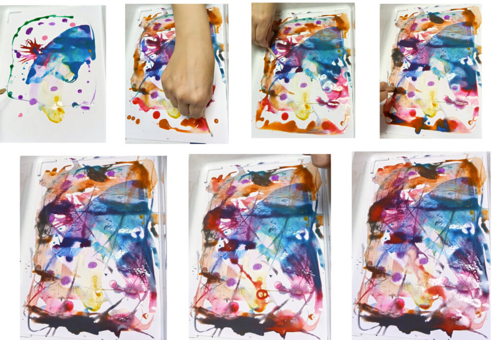 スポイトで色を置いていきます。何周目かで、Tくんが、とてもやりにくそうなのでした。困っているようなので、何か困ってる?なんでもいいから言ってみて?と、言いました。少しして、言いにくそうに、「何をしたらいいか、わからない。。」と言いました。ああ、そうか。そう言われることは、ときどきあります。