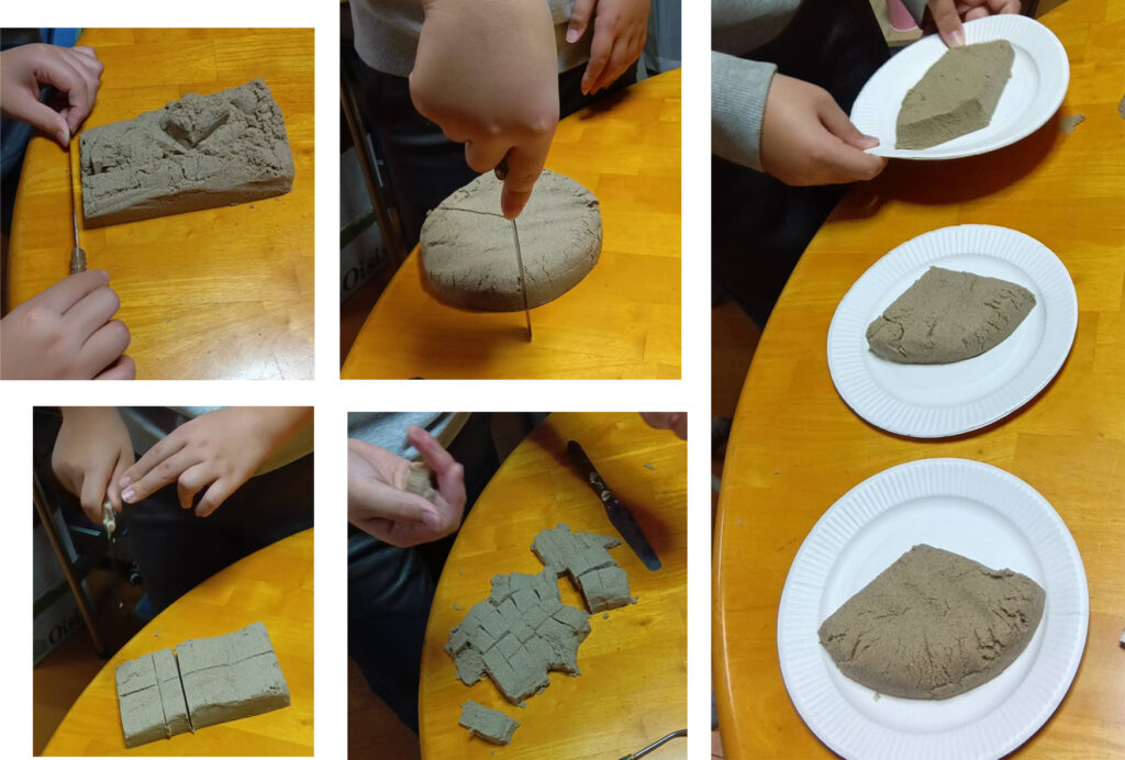 写真-8 キネティックサンドで遊びます。この砂はキュッとまとまるけど、切り口も綺麗なんだけど、移動させるのがむずかしい。ボロボロ崩れそうになるのを、上手いこと、サッとお皿に乗せる💗3等分もいい感じです。お腹すいてきちゃいました!