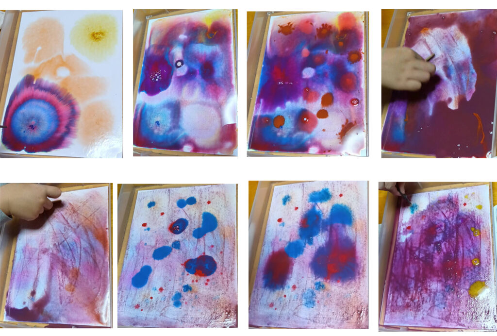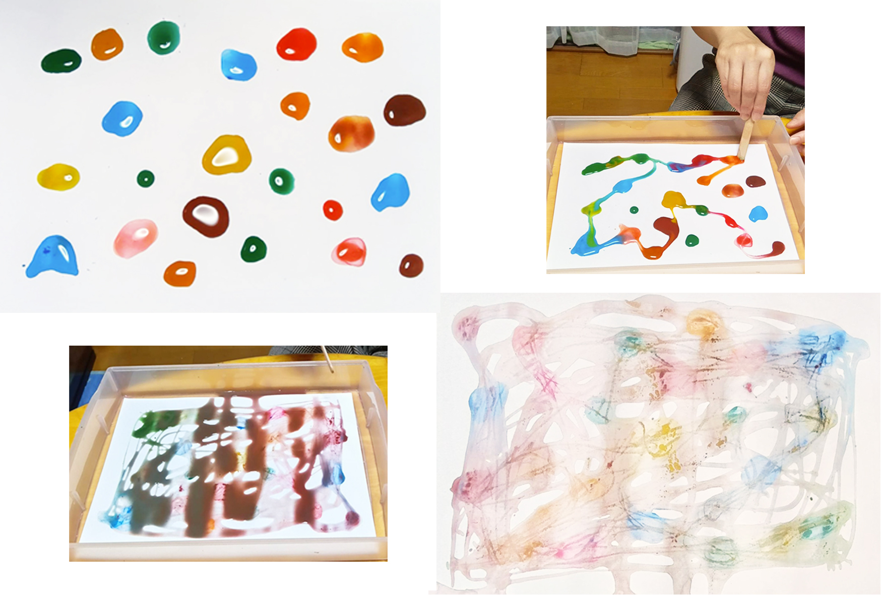 スポイトで水のしずくを置いて、そこに絵の具を垂らす遊びをおすすめしましたら、素敵な小石がたくさん出来ました。その後で、このままでもいいけど、このしずく繋げていくのも面白いですよーと遊んでもらいました。