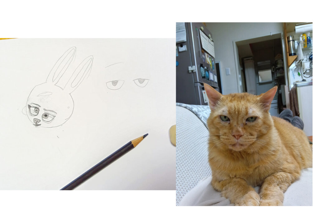 写真-7 Tくんの絵です。ジュディを描いている時、ネコが近くに来たので、ネコの目も描いてました。ウチのネコは、うん、こういう目つきです。