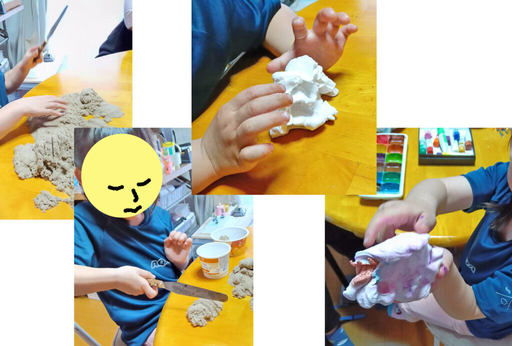 そのあと、どうしようかな?砂、あるけどやってみる?と聞くと、Kちゃんと目がしっかり合いました。お母さんによるとHPの砂遊びの写真に、興味を持っていたということでした。だんだん表情が出てきて、Kちゃんらしくなっていくようです。お母さんがKちゃんの砂の山に触ろうとすると、サッと手をよけたりしています。お母さんが、さらにちょっかいを出すと、笑いながらはっきりした声で、「だめー!💗」と言うのでした。おお、この感じは手ごたえあり!という感じですか?!と聞くと、お母さん、うれしそうなのです。元気になってたくさん遊んで、「他のことして遊びたい」とKちゃんのリクエストなので、紙粘土やってみようか?とお渡しします。