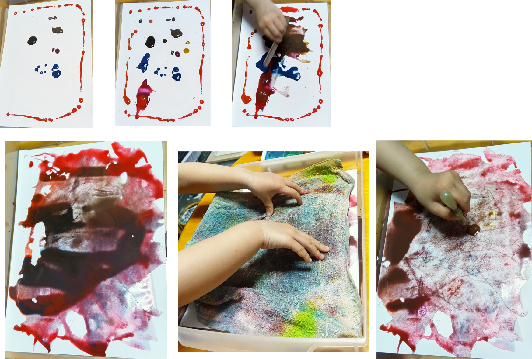 もう1枚、スポイトで遊びます。今度は、Kちゃん、遠慮なく始めていく感じです。アイスの棒も、ふきんも、自由に使って、2枚目はサクッと完成しました。