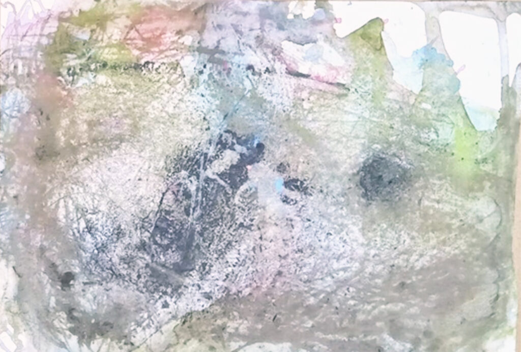 スポイトを使って、2人で1枚の絵を描いて遊びます。Kちゃん、スポイトは初めてですが、だんだん使い方がわかってきて、絵の具をたくさん落とせるようになってきます。お母さんも、絵の具を落としていって、画面は豊かな感じになって、絵の具がタプタプしてきます。最初の面白さが、少しペースダウンしてきたので、アイスの棒を渡します。お母さんが、線を描いて遊び始めると、Kちゃんも、線を遊びます。少しして、アイスの棒を横にして、絵の具を押していくのもできるよ?とおすすめします。Kちゃん、やってみてます。バットを傾けて、絵の具を流すのもやってみます。ひと息ついたところで、ふきんを平らに置いて、絵の具を吸わせるやり方があるんですが、やってみていい?と聞きました。Kちゃん、たぶん意味がわからなかったと思うけど、うん、とかすかにうなずいたので、ふきんに絵の具を吸わせます。タプタプの絵の具がなくなると、また新鮮な感じで、色を足して遊べます。少し遊んで、この絵は完成となりました。