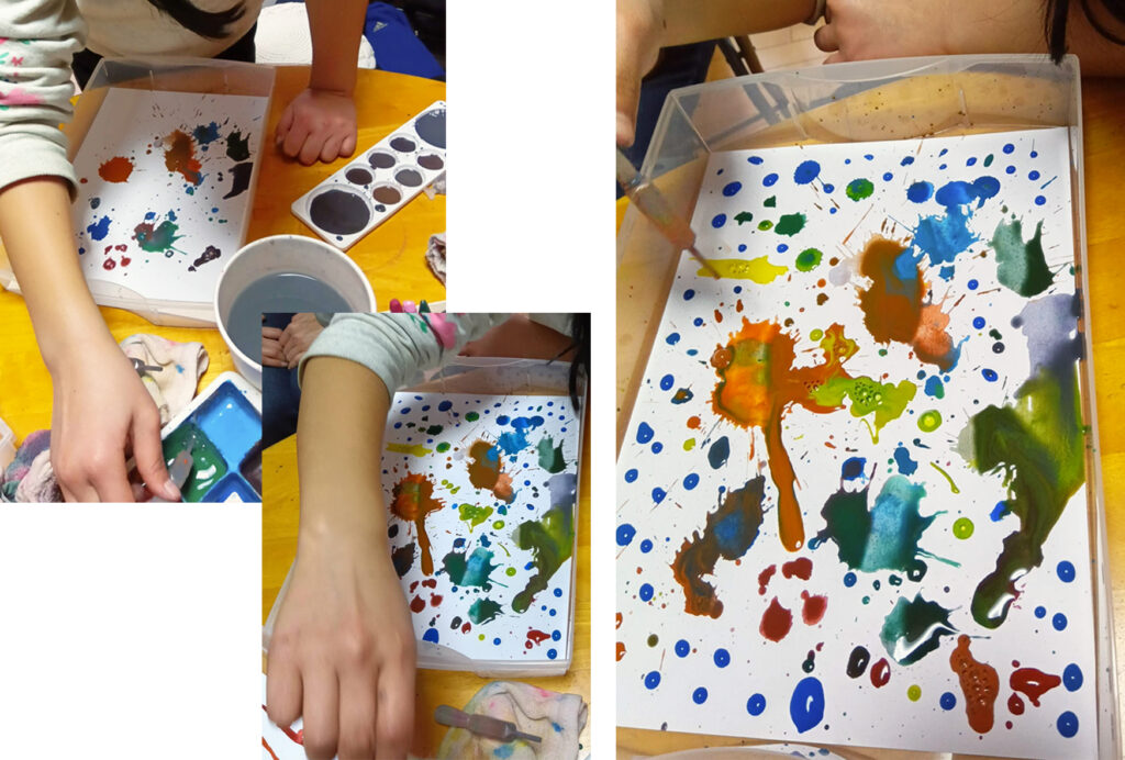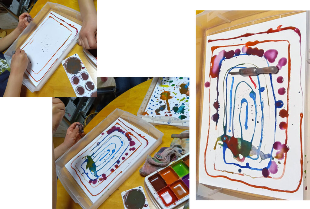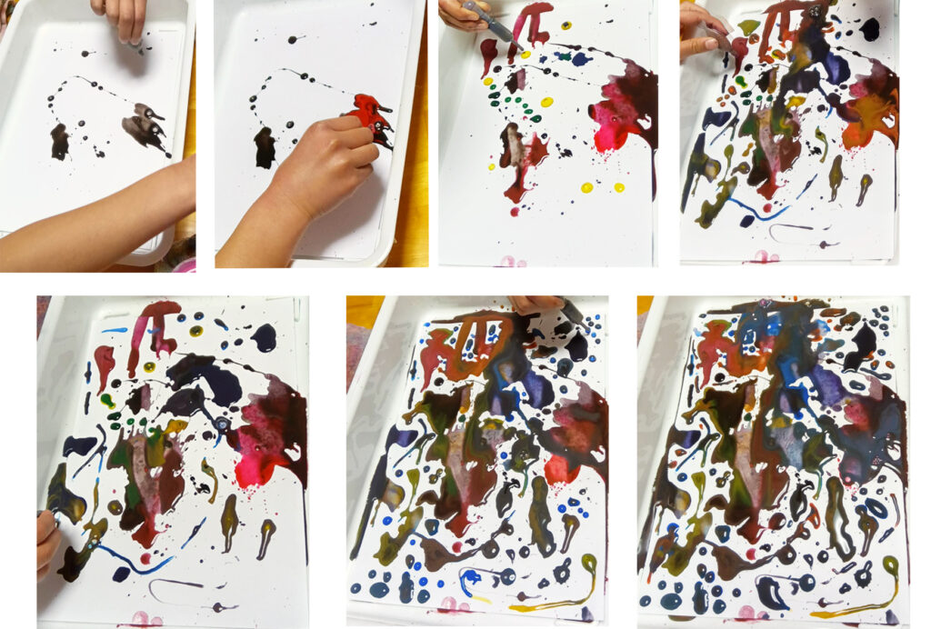今日は最初に3人で1枚の絵を描きました。スポイトで色を置いていきます。Yくん、早く遊びたくて、順番を飛ばしがちです。なかなかにあわただしく、絵は始まっていくのでした。今日は、ダークな色から始まってます。2人とも、色を混ぜて、茶色や濃いグレーの色を作っています。