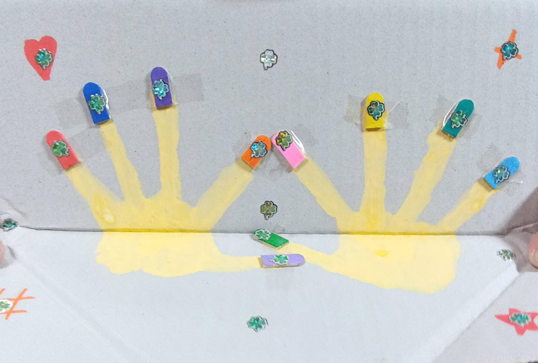 何しようか?と聞くと「爪、やる!」って、ダンボールに手形を描いた工作のことでした。アイスの棒で作ったネイルを、セロテープで留めていきます。セロテープを切るのは、工夫しながらできるのでネイルに貼ってから、ダンボールに留めていきます。貼りながら、「シールない?爪の上に貼りたいの」と、シール探しも始まるのでした。ネイルの工作は楽し気にサクサクと進むのでした。