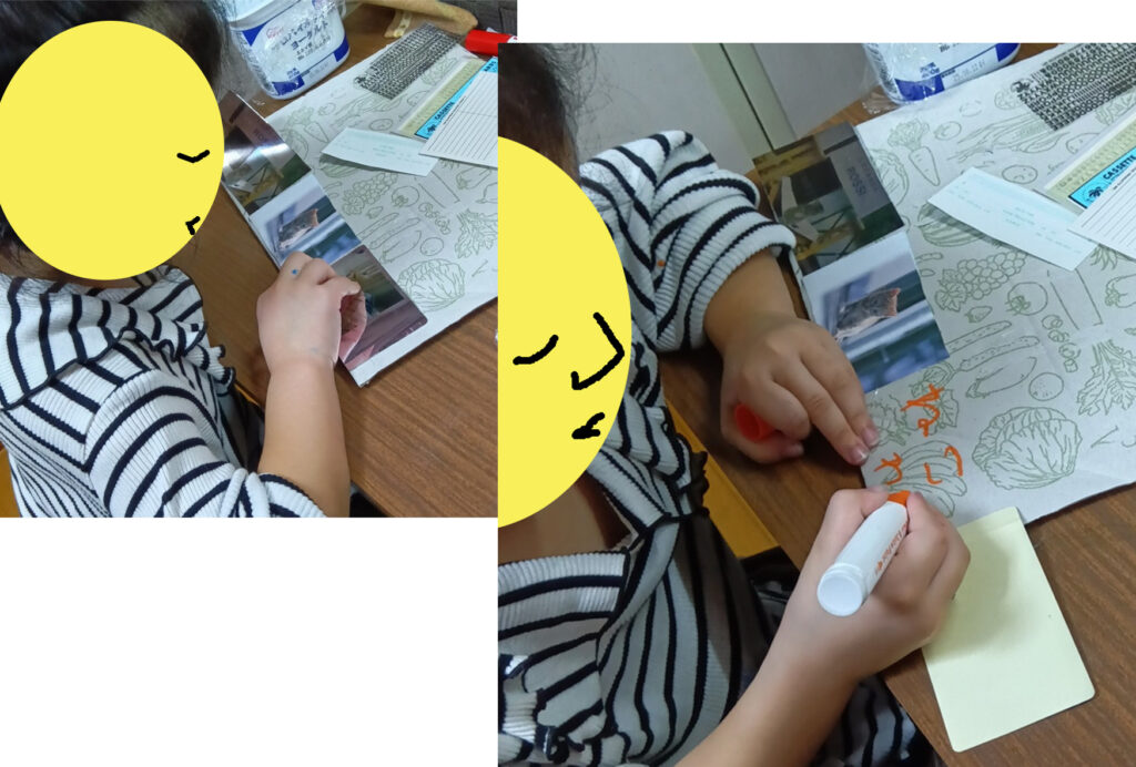 写真-4 ネコのカードを見つけて、集中が始まります。切って貼る、書く。全部、楽しんでます。
