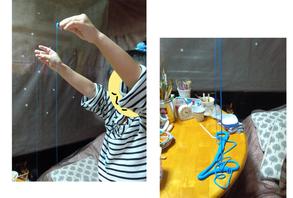 小学生のお友達も、スライムが出来たところでした。Hちゃん、さっそく同じテーブルにやってきて、スライムで遊びました。「スライムこんなに伸びるよ大会」では、高いところからスライムを落として伸ばすのを、よーく遊んでました。スライムって、こんなに細くのびるんですねー!